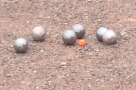 A target ball, called a cochonnet or “coch”, is thrown down the piste first. Then the players compete to throw their boules nearest to the coch and score points towards a total of 13.